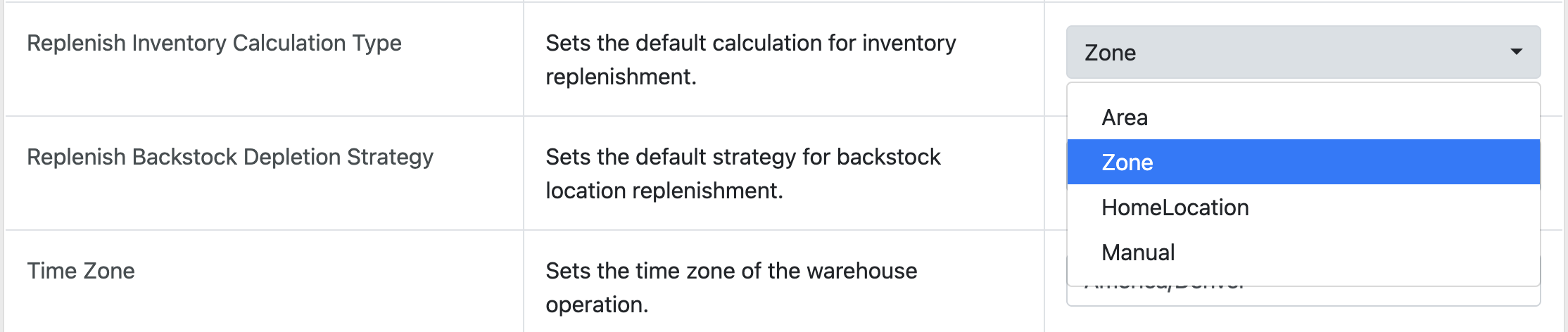 Using Replenishment performs a live calculation during the Replenishment Planning and Replenish Pick action. The live calculation will consider the type of replenishment set on the site-wide level. Be sure to select Area, Zone, Home Location, or Manual to match the type of replenishment that is being used to generate tasks. Otherwise when tasks are pulled to devices, they may not show up if they don't match the set Replenishment Calculation type.